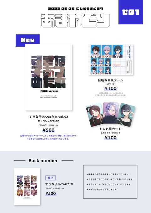 16 39 5/5のにじそうさくのお品書きです! 全部男の子の本で三枝明那くん多めです🌶 トレカ風カード少し多めなので先着で本購入者にメッシャーズランダムで1枚お渡しいたします。 【せ01】でお待ちしております〜! #にじそうさく07 23/05/04 09:57