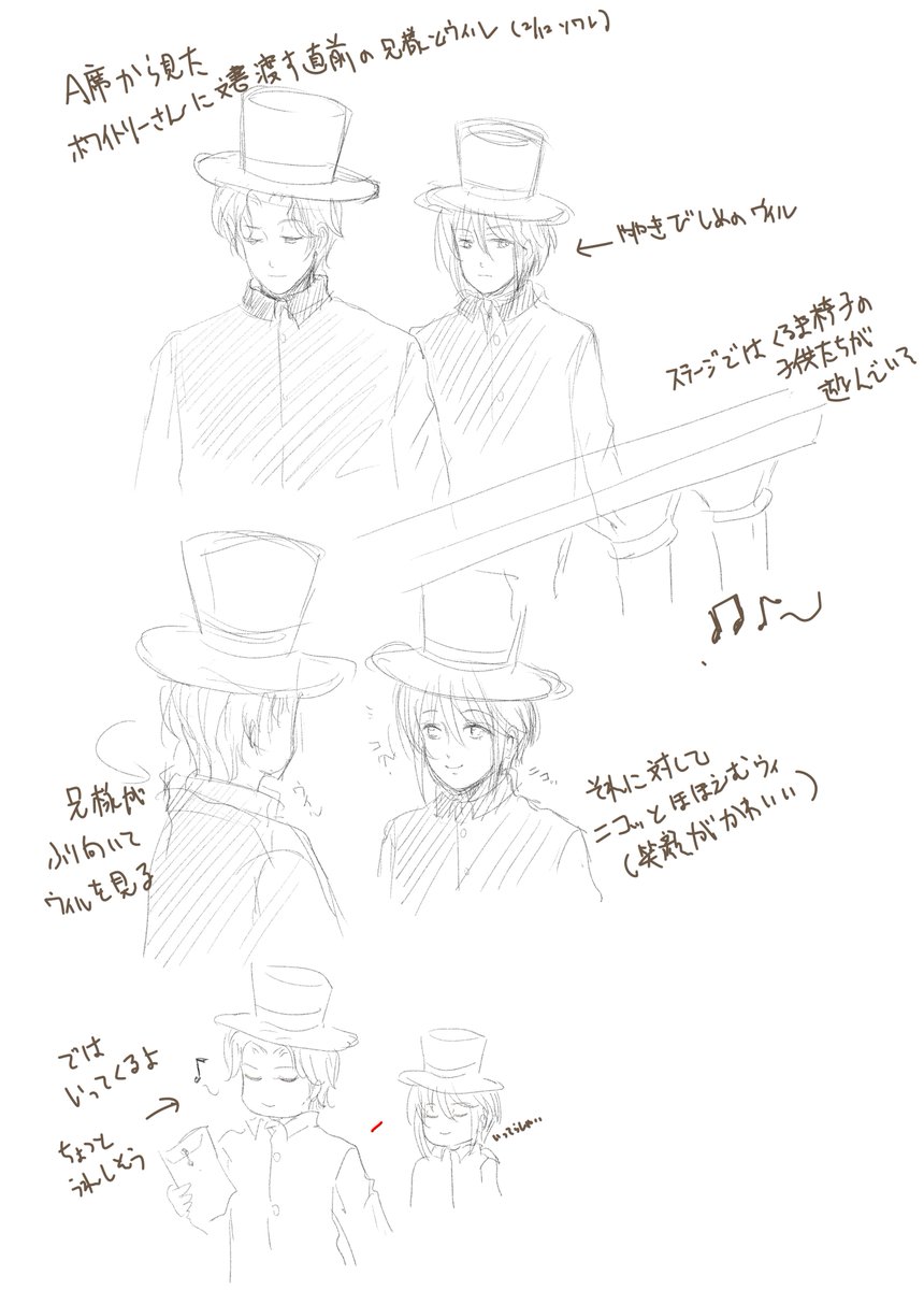 5 28 A席から見た兄様とウィのやり取りの落書き(公園でホワさんが歌っている間)。ほほえましいやり取りだったので印象的でした。 2/14ソワレにて 23/02/15 20:48