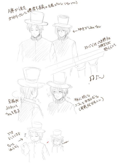 A席から見た兄様とウィのやり取りの落書き(公園でホワさんが歌っている間)。ほほえましいやり取りだったので印象的でした。 2/14ソワレにて