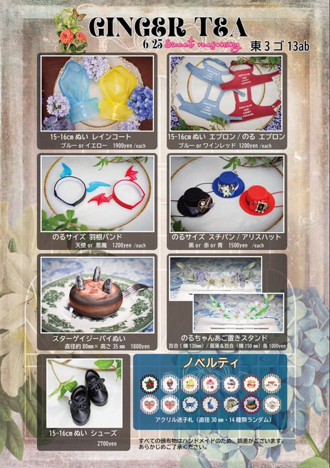 56 93 6/25 Sweet reasoningお品書きです。15-16cmぬい服とのるちゃん用物がメインです。 各頒布物の詳細と写真はリプに紹介します。 燕尾服セットは間に合えば別途でお知らせします。 ノベルティはアクリル迷子札となります。 よろしくお願いします🙇♀️ 23/06/18 20:44