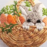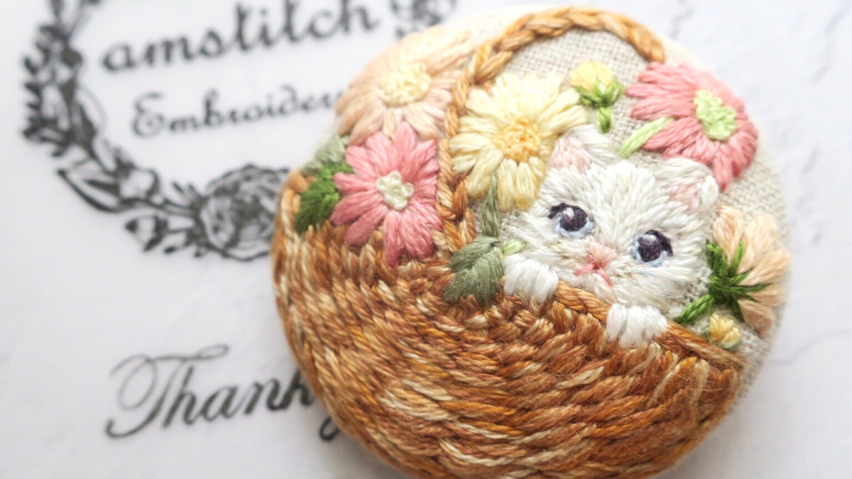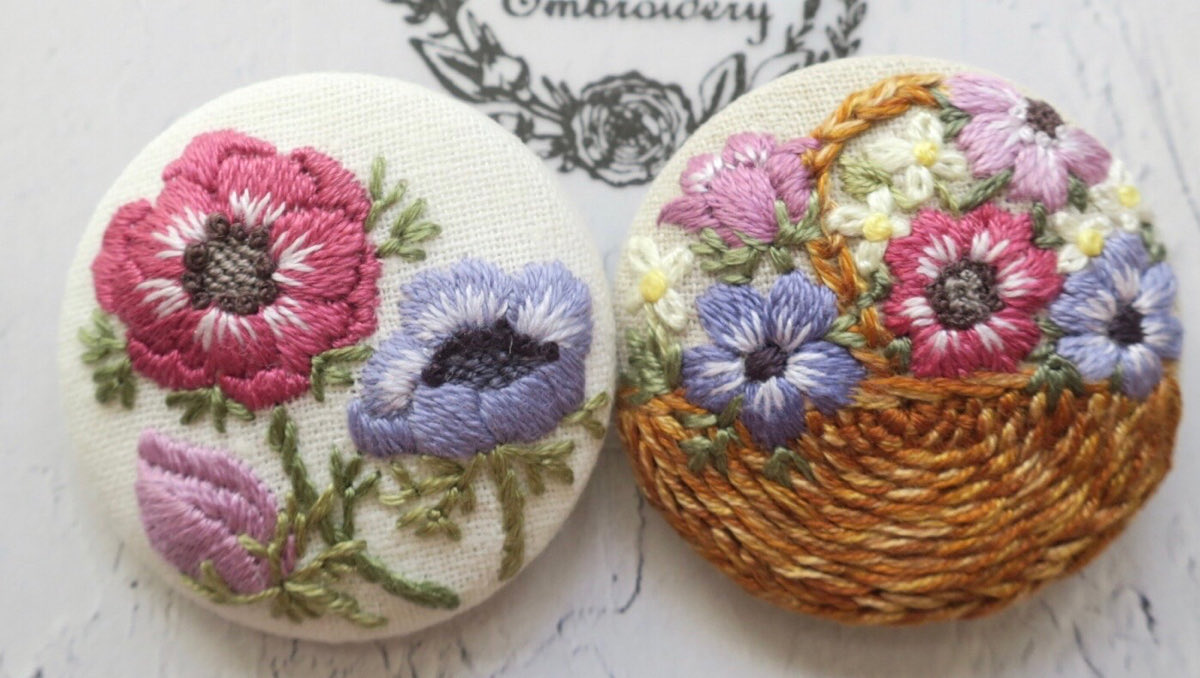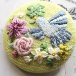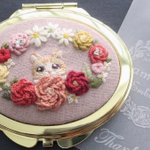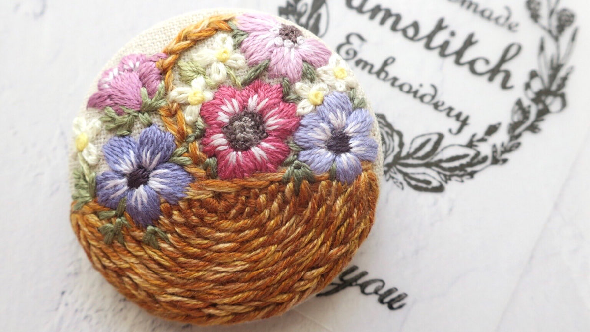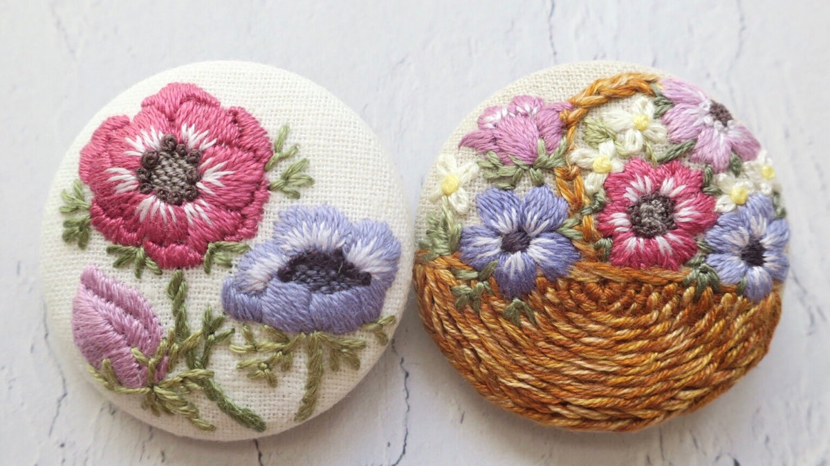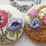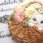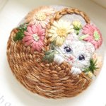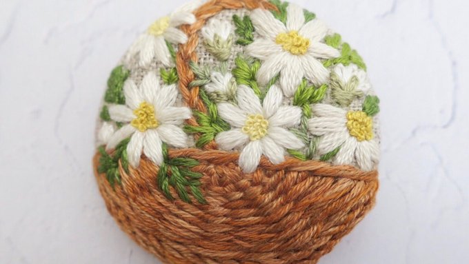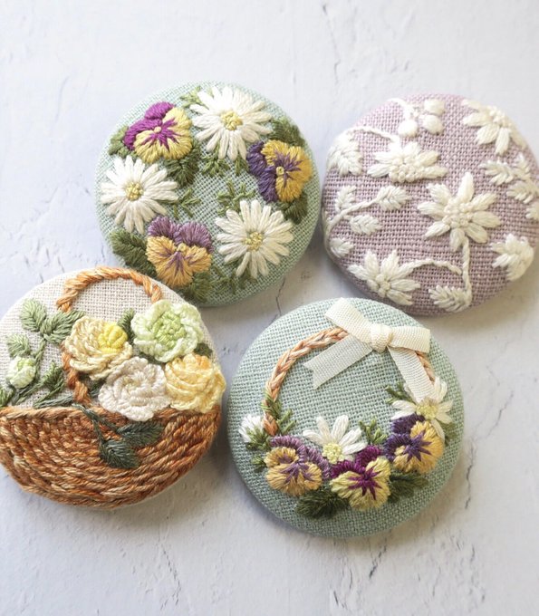#4月になったのでフォロワーさんに自己紹介しようぜ くるみボタンの丸みを活かして、花かごの刺繍をする事が多いです😊主に刺繍ブローチ、時々ピルケースとコンパクトミラーも作ります🪡改めまして、どうぞ宜しくお願い致します🌷🙇♀️🌷
