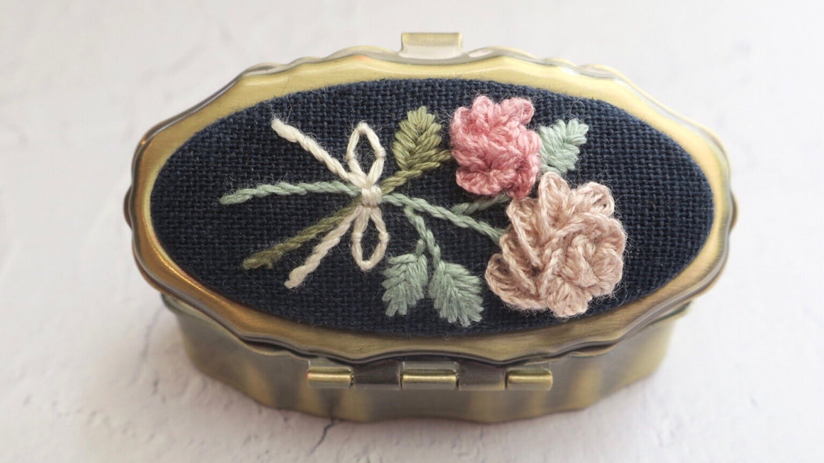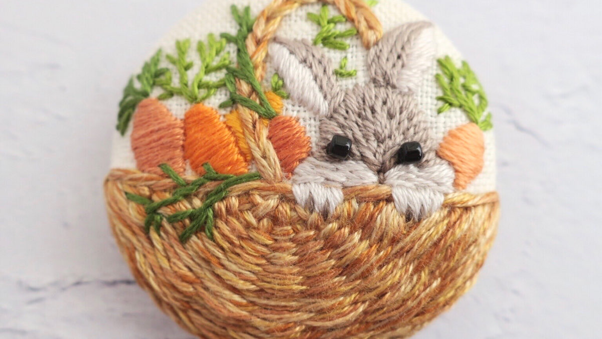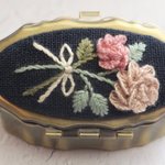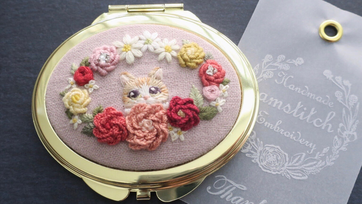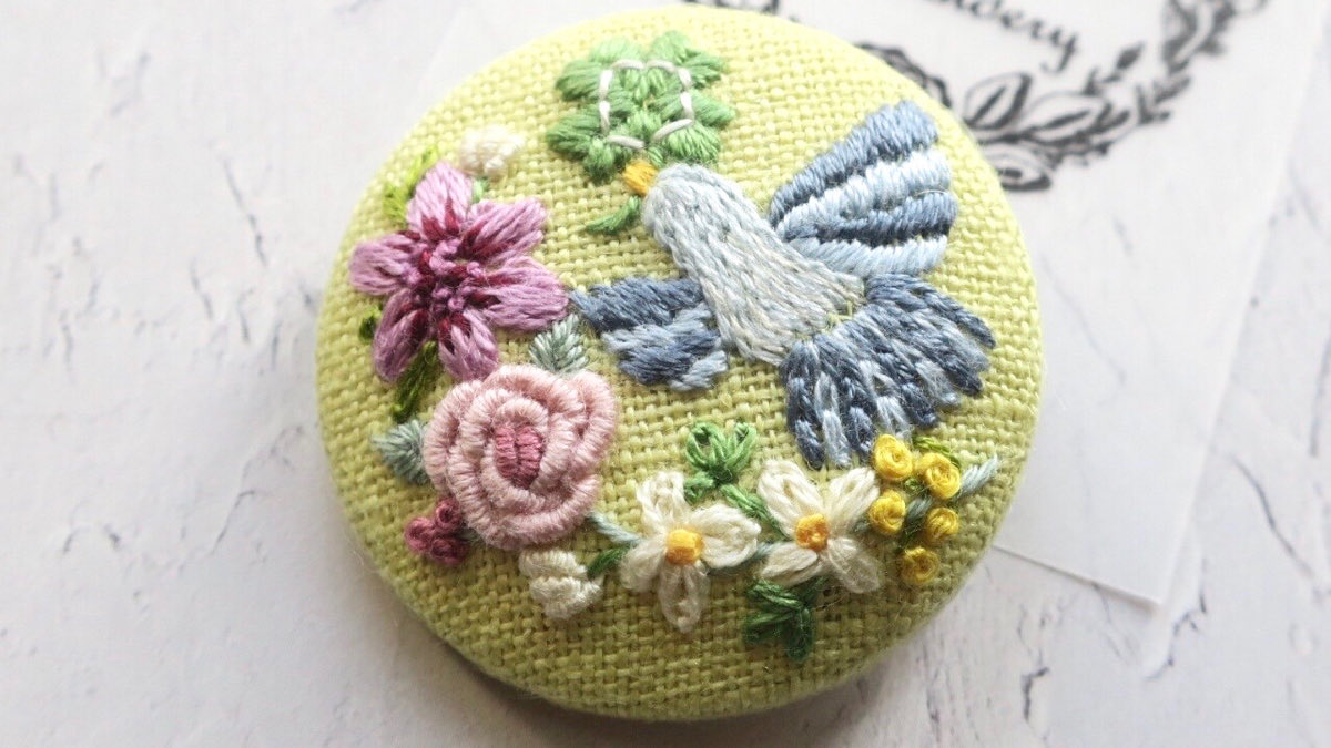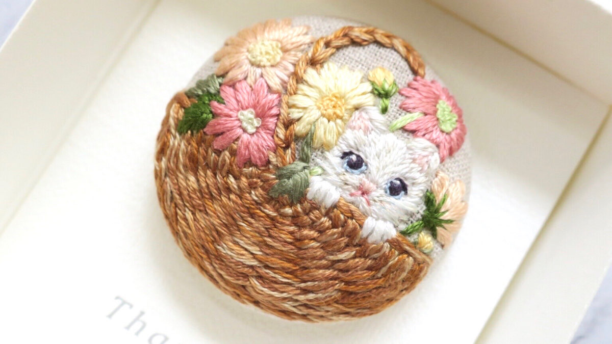 #4月になったのでフォロワーさんに自己紹介しようぜ くるみボタンの丸みを活かして、花かごの刺繍をする事が多いです😊主に刺繍ブローチ、時々ピルケースとコンパクトミラーも作ります🪡改めまして、どうぞ宜しくお願い致します🌷🙇♀️🌷