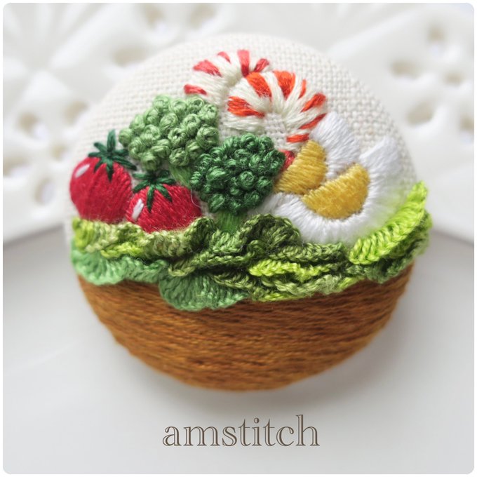 #夏の創作クラスタフォロー祭り くるみボタンの丸みを活かした刺繍作品を制作しています😊 今日も穏やかな1日となりますように🍀 🪡 minne.com/@amstitch #刺繍 #フェイクフード #ハンドメイド