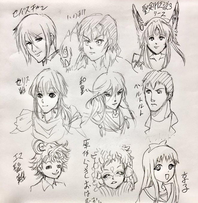 #お絵かき #絵描きさんと繋がりたい #フォロワーさんの推しが描きたい #イラスト好きさんと繋がりたい #ゲーム好きな人と繋がりたい まだ練習です。キャラ把握のために並べました。なるべく原作寄りの絵で。初書きして描き直すと違うから練習して動き出して枠に入れます。カラーです、お待ち下さい
