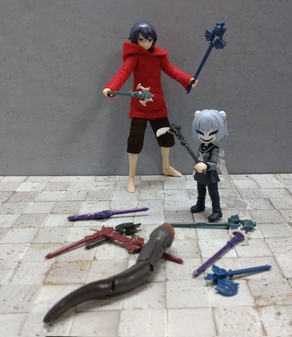 1 1 暗黒の武具ピック持てるか実験。 モデルはスクストのサトカちゃんに改造途中のまま4年位経ってるウィッチちゃんとみわちゃん。 敵役はデンキウナギさん。 結果はメガミは普通に持てるけどアクアシューターズはピック部分切り落とすか削らないと持てなかった。 #メガミデバイス #アクアシューターズ 23/02/15 17:59