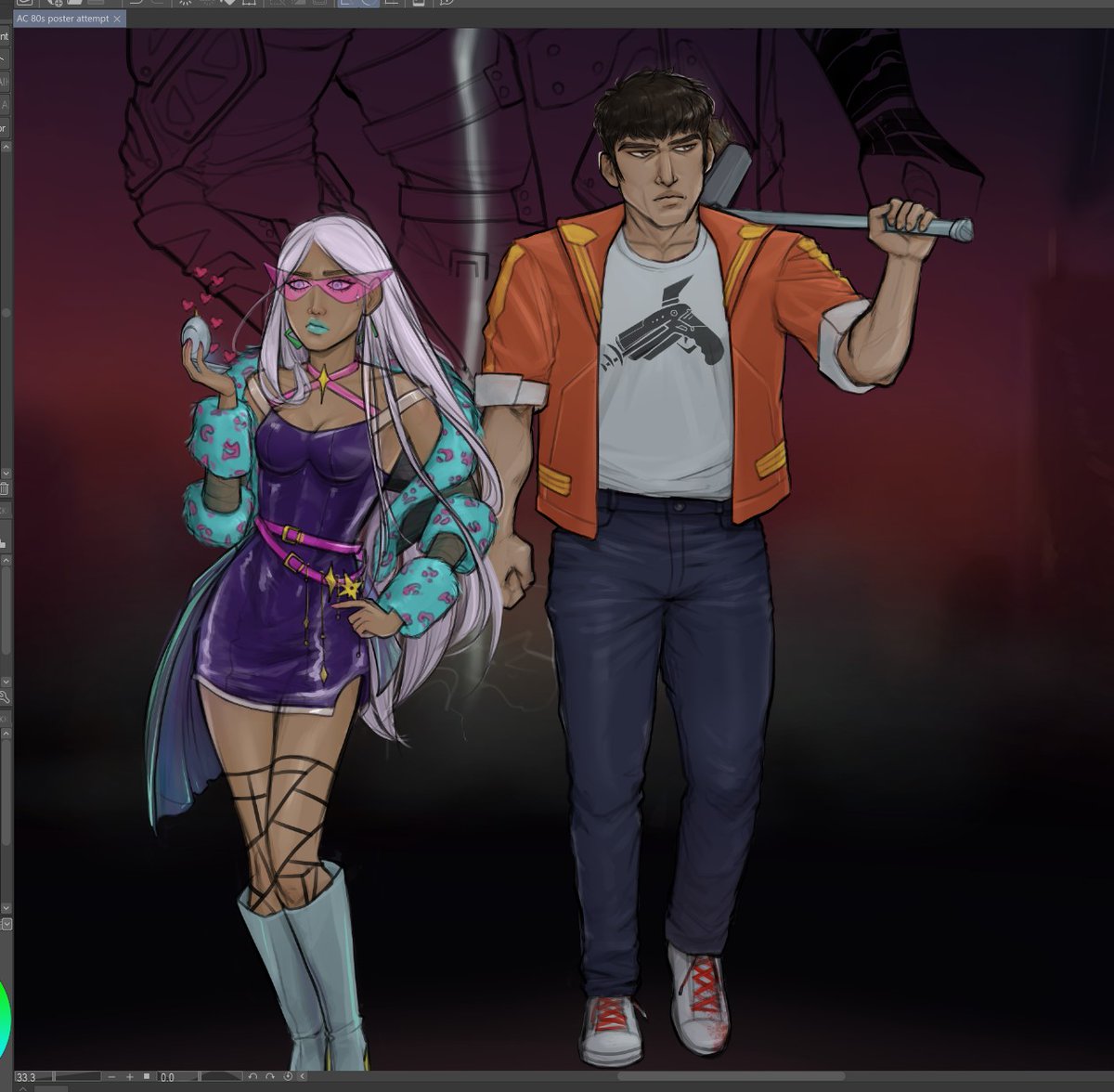 '80s movie poster' spoof ongoing ouo... Rosie! (1of5 needing color). ---Rosie's design is very much based on @SRattanachane depictions, since its her PC ^u^. #workinprogress #dndparty #dndart #dndcharacter #dndbard #characterart #charactersketch #characterdrawing #cyberpunkart