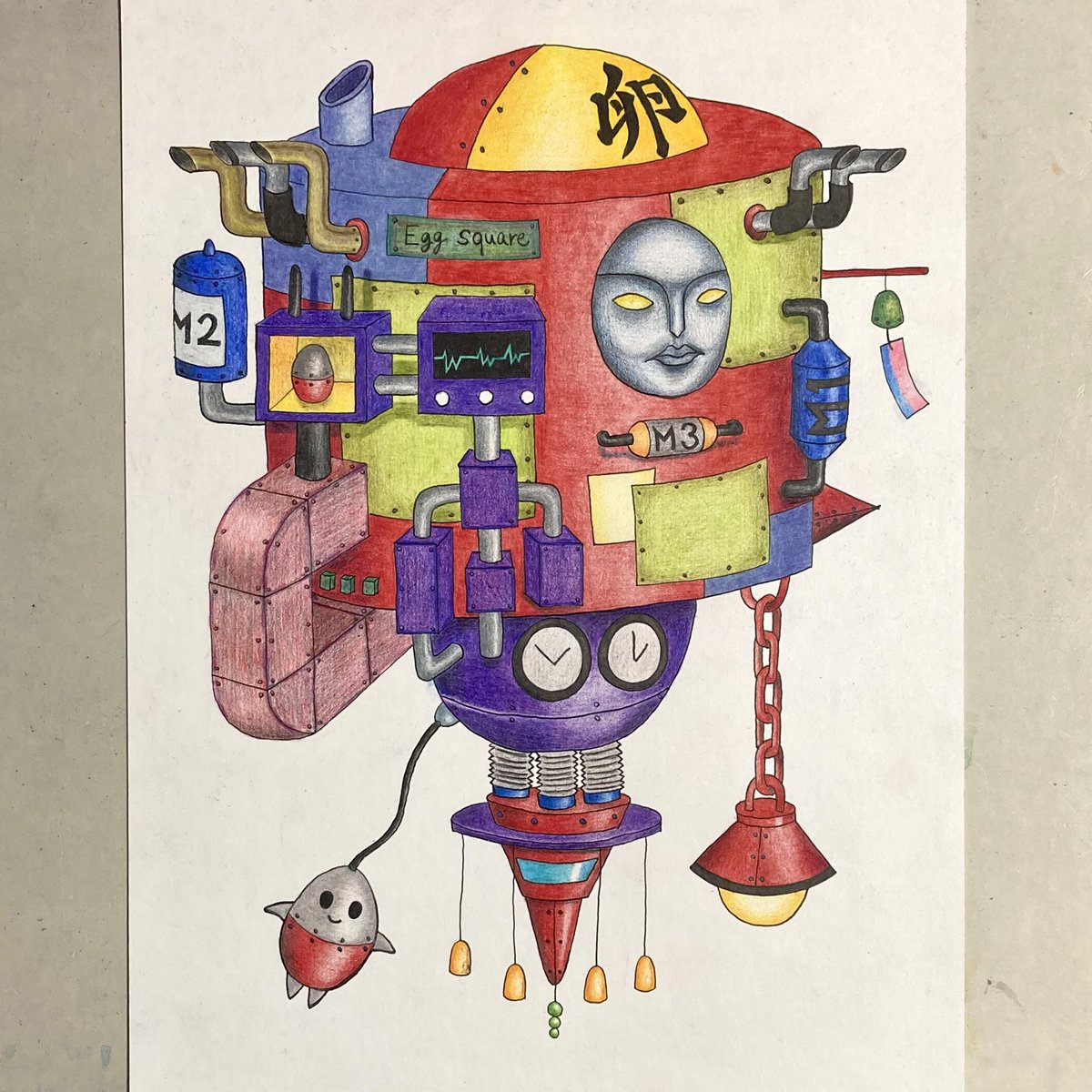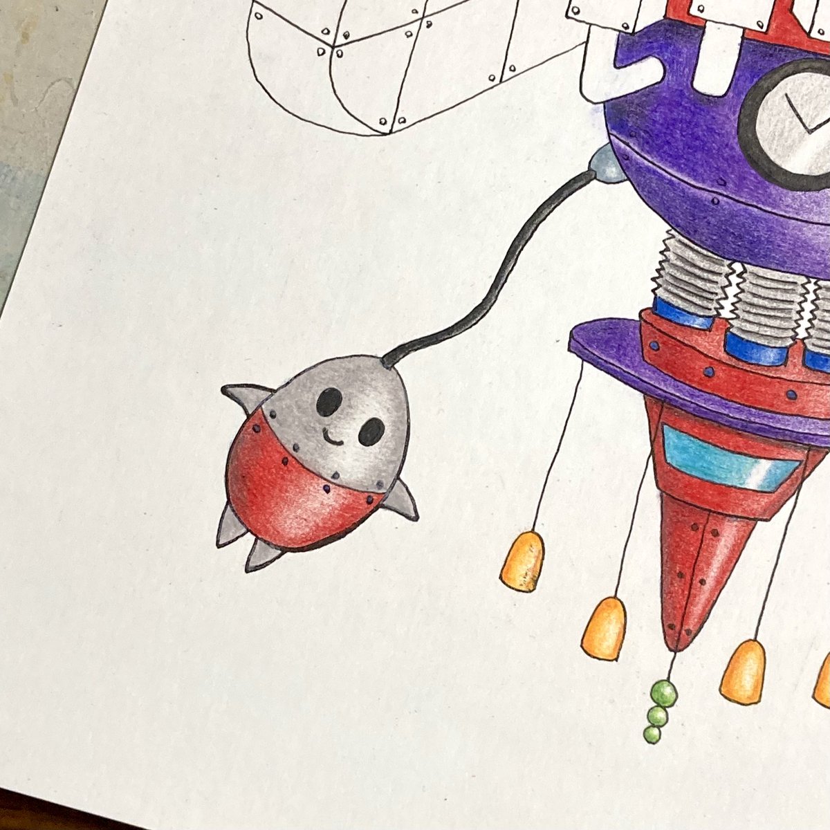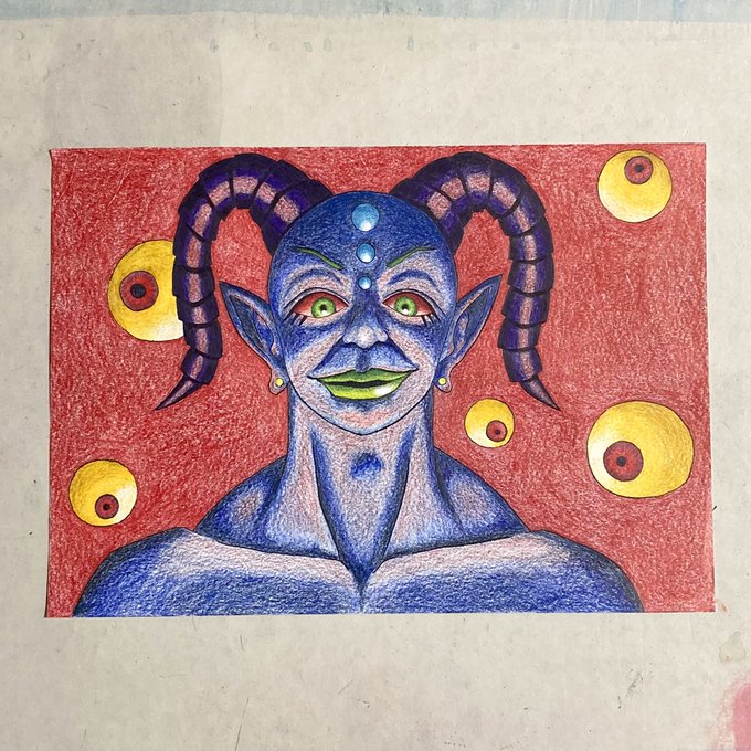 色鉛筆の方もできたー 顔を練習していたんだけどツノ生やしたら悪魔になったんですよ 不思議なこともあるもんですねぇ #イラスト #色鉛筆 #物語の中盤の最強の敵だと思ってたら後半になるにつれてあいつ全然強くなかったじゃんってなるやつ #黄色い目玉が浮いているやつ