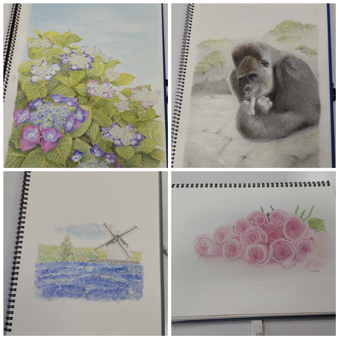 2 4 西山欣子先生の「はじめての色鉛筆画」講座に おじゃましました。 4枚の絵は受講生の作品です。 植物、動物、風景など、 皆さん楽しそうに描かれていました🎵 #色鉛筆 #色えんぴつ #色鉛筆画 #絵画 #風景画 #バラ #あじさい #ゴリラ #阿南カルチャーセンター #コスモホール #カルチャースクール 21/06/18 11:53