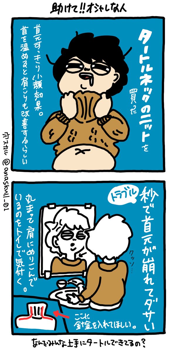 助けてお洒落な人。タートルネックのニットってどうやって着るんか。 note.com/anaskull_01/n/… #note #漫画が読めるハッシュタグ #イラスト好きな人と繋がりたい #お洒落な人と繋がりたい #お洒落な人コワい