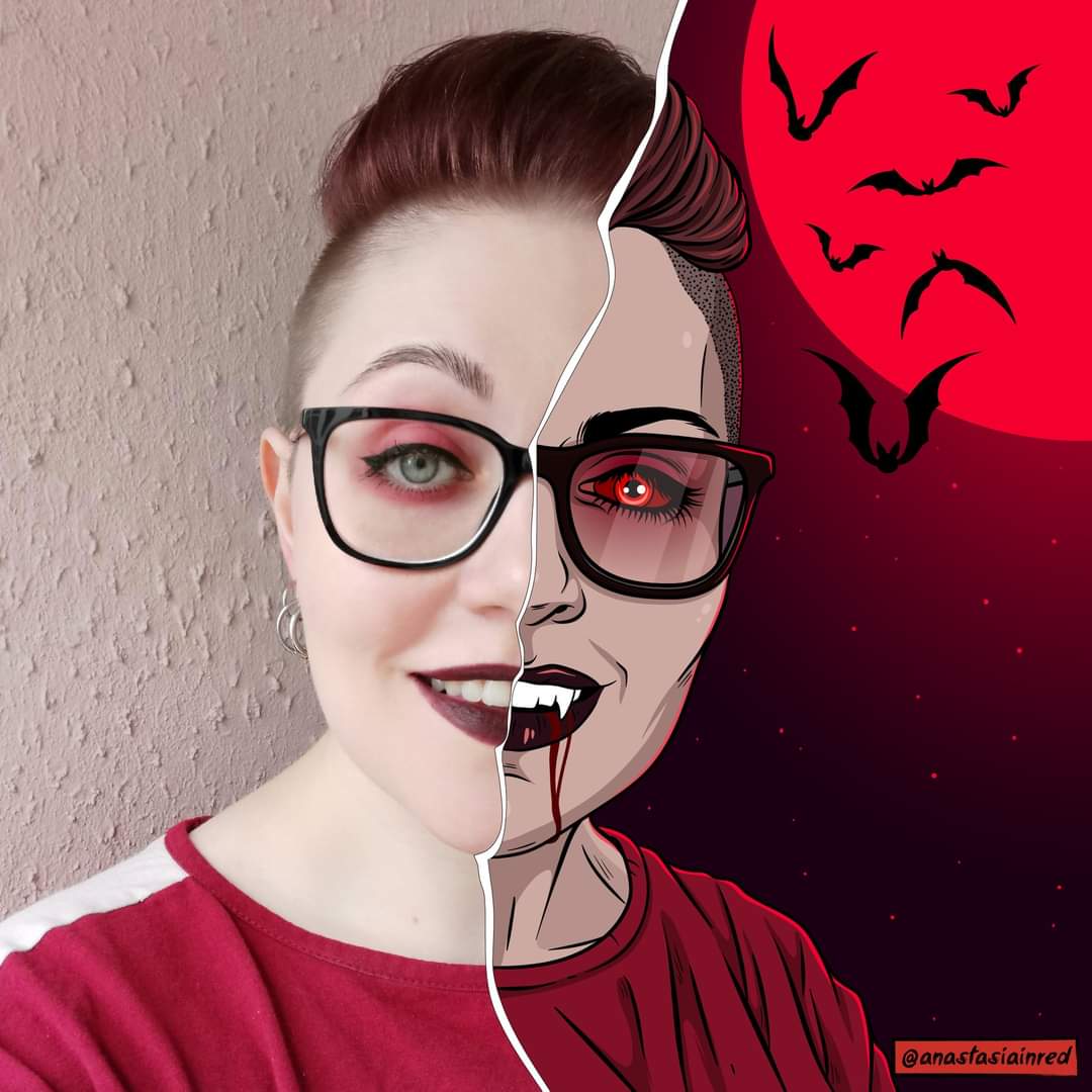 My collage for #artvsartist2021 Sometimes people say that I look like my characters 🦇 What do you think? #NFTCommunity #NFTartist #darkart