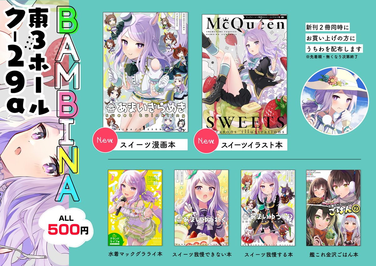 #C102お品書き 土曜東ク29a【BAMBINA】 ウマ娘・メジロマックイーンスペースです -------------- 新刊①イラスト本melonbooks.co.jp/detail/detail.… 新刊②漫画本melonbooks.co.jp/detail/detail.… -------------- 新刊2冊同時購入の方にうちわのおまけをお付けします。 当日はどうぞよろしくお願いします〜!