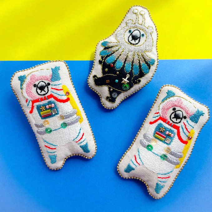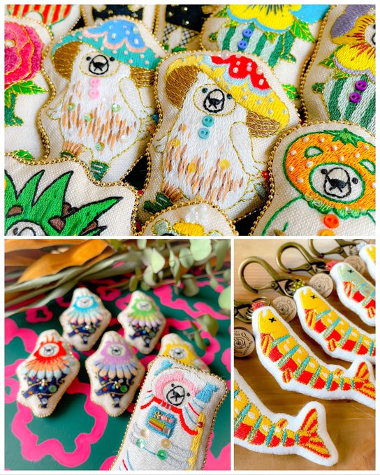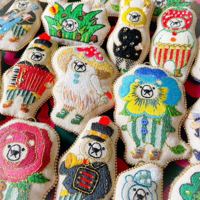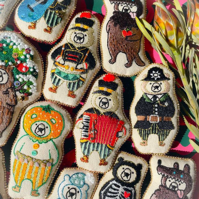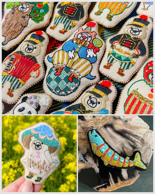 オシャレを楽しむちょっと変わったクマの「オシャクマさん」の装いを刺繍ブローチにしてます🐻サカナもいるよ🐟 🎪イベント情報🎪 ▶︎ 7/6-17 和歌山 雑貨店「a table」さんのブローチ展に委託参加します🙌通販あり☺️ 🌷Instagram🌷 instagram.com/maison_de_osya… thank you! @Lupopo_cafe 様