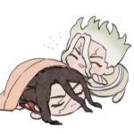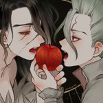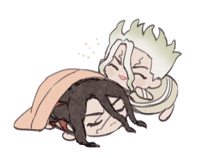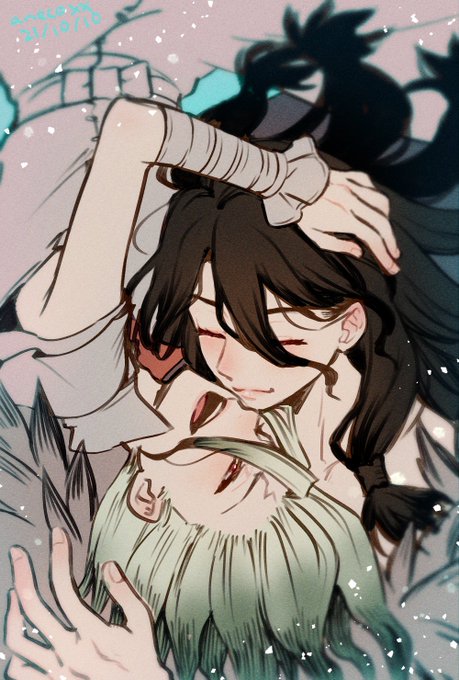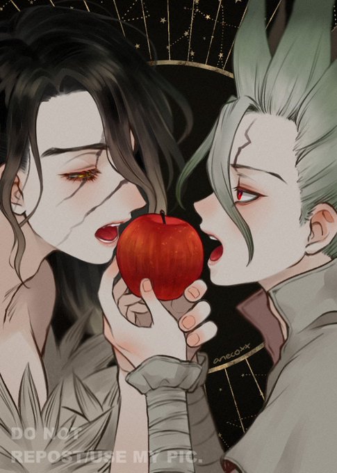 一年前に発行された司千プチオンリーの記念アンソロ、『友だちの境界線』様に寄稿させていただいたイラストです。掲載許可をいただいたので投稿します! テーマが"ブロマンスアウト"だったので、私が思う司千が一線越える絵を描きました🍎 #つかせんプチ記念アンソロ