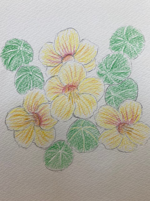 本日のお絵描き。今日の誕生花・ナスタチウムです。赤い模様のバランスが難しいです…食べられるそうなので、いつか食べてみたいかもです。😋 #アナログイラスト #アナログ絵