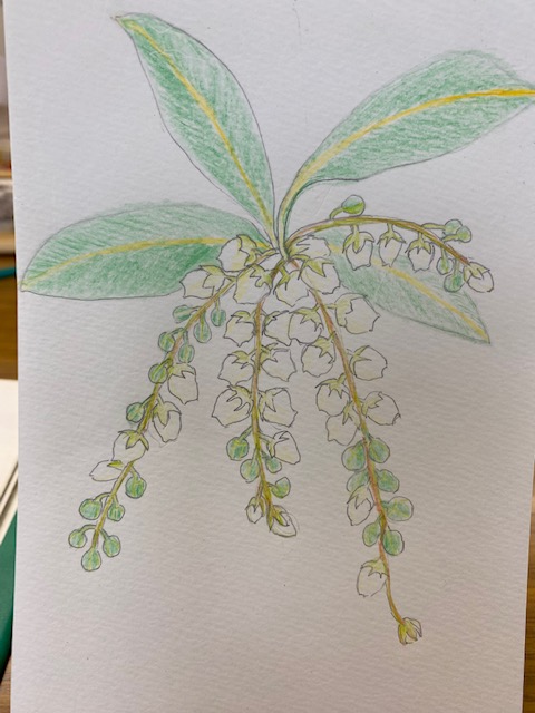 本日のお絵描き。馬酔木(あしび)の花です。毒がありますが、その毒を駆虫剤にしていたこともあってそうです。小さな鈴なりの花が可愛らしいです。 #アナログイラスト