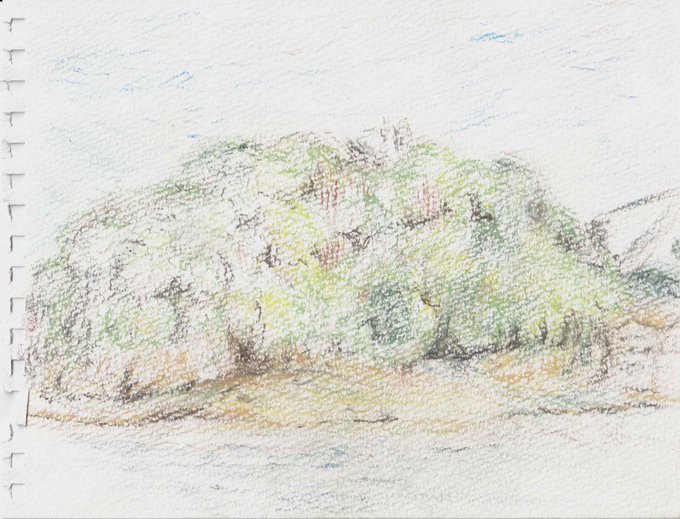 昨日のスケッチに30分くらい手を加える🎨このひょっこりひょうたん島みたいな所はどうやって行けるのかな?なんか洞窟みたいなものがあるが… #パステル #パステルペンシル #色鉛筆 #落書き #一日一アニマル