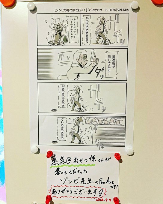 🧟♂️ファンアート展示🧟♀️ 蒸気さんが ( @fymXSJpJDp5ud1H ) ゾンビ先生のゲーム実況を マンガにしてくださいました! 感涙です🧟♂️😭 ご本人に許可をいただき 印刷して研究室( #魔窟 )のドアに 展示させていただきました♪ 蒸気さん有難うございます! 皆さんの #ゾン絵 お待ちしています🧟 #Vtuber