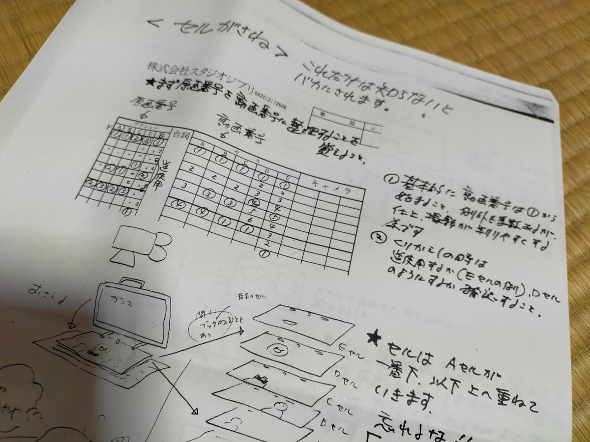 こんなものも出てきた。 宮崎さんがスタッフ(作画マン)に注意するためのメモ書き。 セルを重ねることを想定しながら作画するべし、の仕組みを説いてくれています。