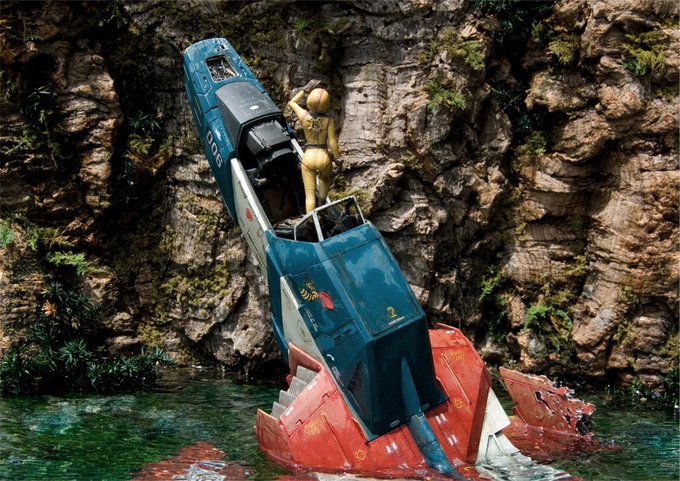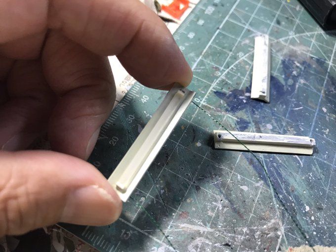 【コンクリートの作り方 その2】 ひび割れはデザインナイフでスジ彫り。コツは・・・ ○線を引くのではなく、短い線を繋ぐように。 ○刃を斜めに入れると線がシャープになる。 ○部分的にコンクリが剥離した感じにスチレンの表面を削る。 #ティタノマキア #ゲイルハウンド #30人のゲイルハウンド展