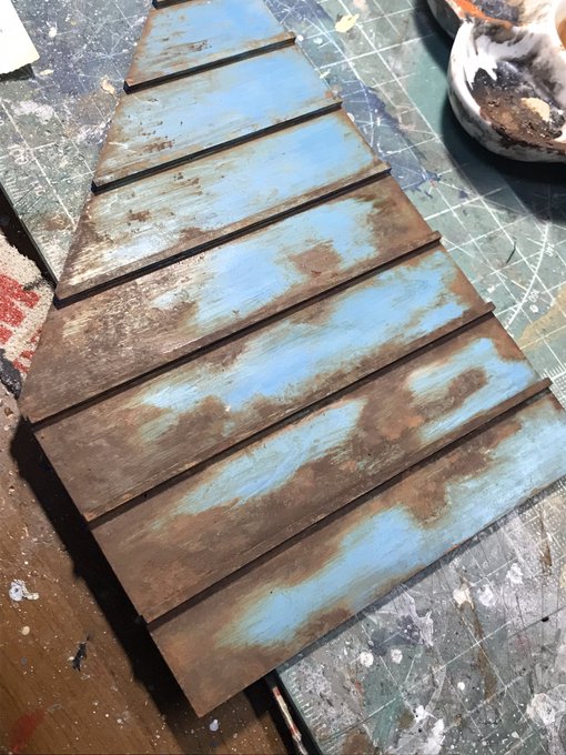 【コンクリートの作り方 その1】 スタイロフォームをL字に切って、それをスチレンボードで覆う。 ツールクリーナーをところどころに筆でタプンって塗ってやれば、じわーっとスチレンボードの表面が溶けてコンクリートっぽい表面になるよ。 #ティタノマキア #ゲイルハウンド #30人のゲイルハウンド展