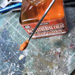 【コンクリートの作り方 その3】 弾痕の作り方。 ○先の尖った物で穴を開ける。 ○穴の周囲をナイフで表面だけ削る。 ○ツールクリーナーを小筆でちょんちょんと塗る。 表面は溶けずに、削ったところだけ溶けるのでコンクリが剥がれた感じになる。 #ティタノマキア #30人のゲイルハウンド展
