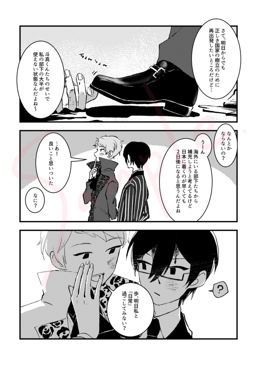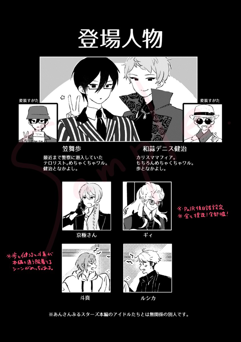 新刊サンプル 5/3【SUPER brilliant days 2023】東6る49a 餃子イソフラボン 新刊「非日常」 A5/32p/500円 PaIRの悪役のふたりが仲良しな本です。 (1/2) pixiv.net/artworks/10717…