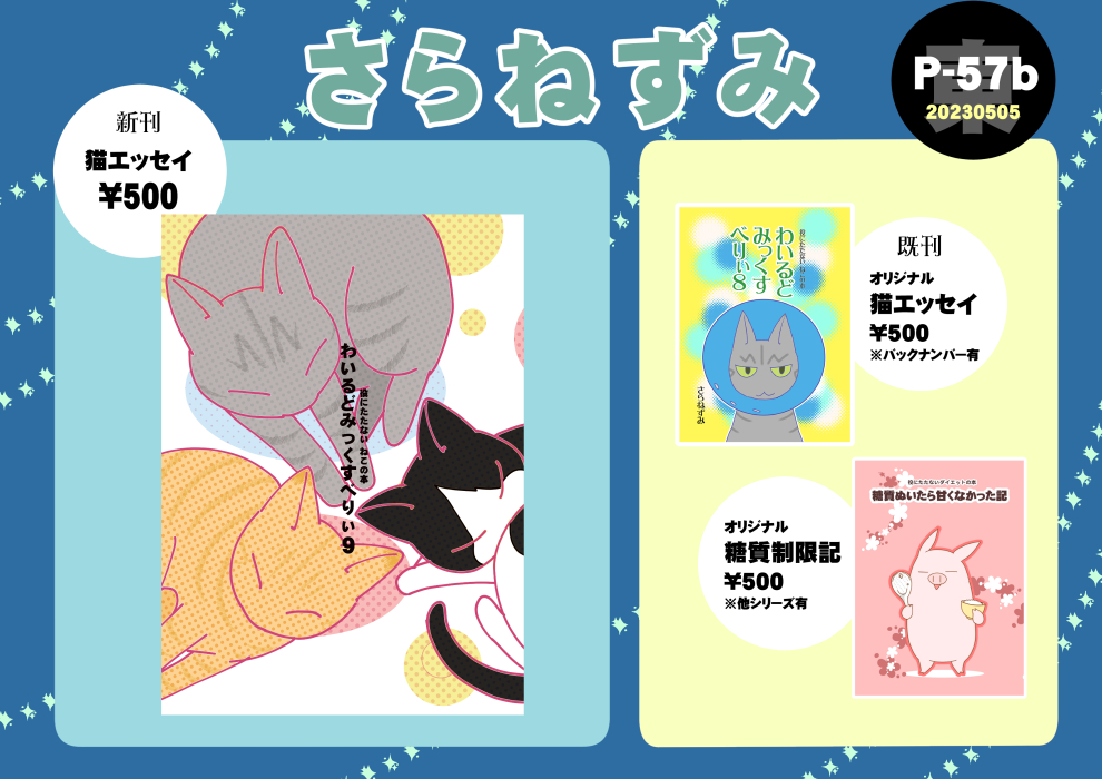 【5/5コミティア144】さらねずみお品書き 新刊と既刊もっていきます。どうぞよろしくお願いします~ #コミティア144お品書き #猫漫画