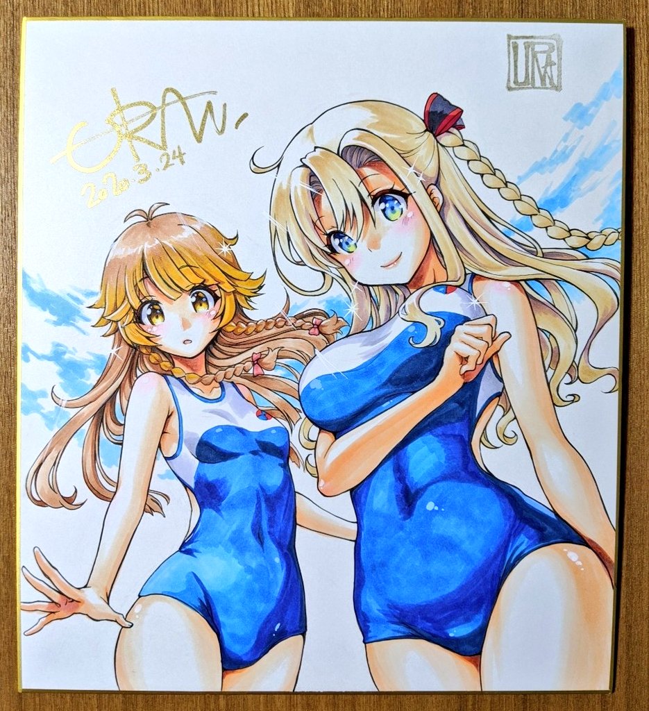 @URAN1017さんにご依頼し、描いて頂いたコピック色紙(その2)。「ハイスクール・フリート」より、ココ&ミーナです。ココちゃんとミーナの表情がなんとも😆横須賀女子のスクール水着をチョイスした辺りは…ご察し下さい。 #コピック #はいふり #ハイスクール・フリート