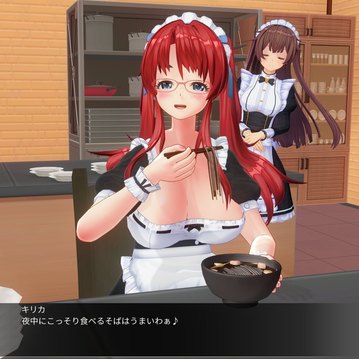 お題「食欲の秋 長髪」 #COM3D2 #cm3d版深夜の真剣エディット60分一本勝負 メイド長に見つからずこっそり食べるお蕎麦の味は格別です。