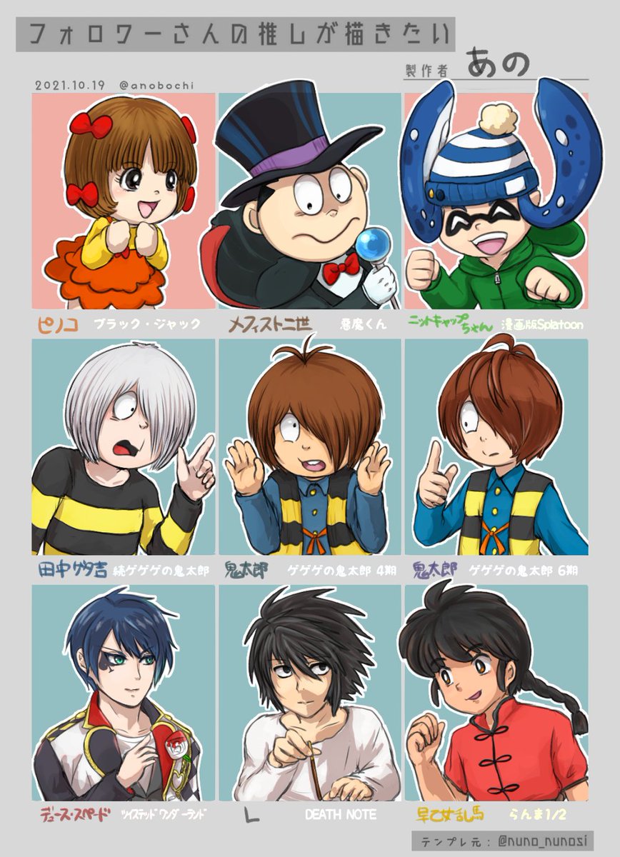 フォロワーさんの推しを描かせていただきました✨ ちょうど1ヵ月前…!ほとんどのキャラはじめてでオリジナリティ薄くてすみません!あとイメージ他違っててもゆるしてください~ いろんな作品のキャラをかけてたのしかったです! twitter.com/anobochi/statu…