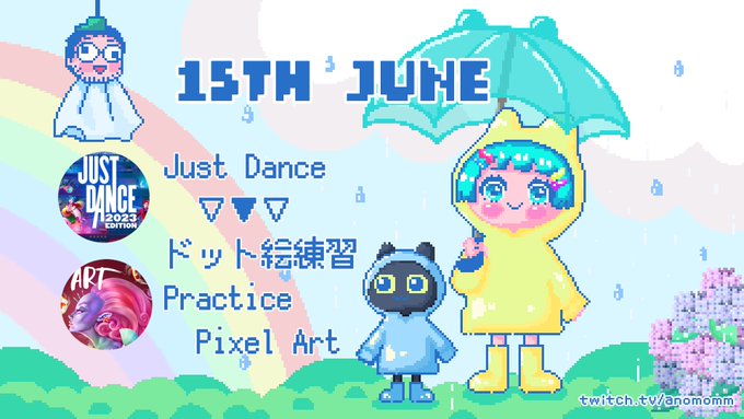 0 3 📢AM9:00~START 💃Just Dance ▽▼ 🎨ドット絵練習 💜Twitch💜 twitch.tv/anomomm #vtuber #Live2D #pixelart #ドット絵 23/06/15 08:06
