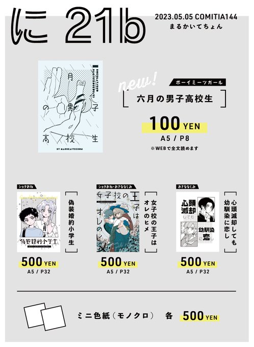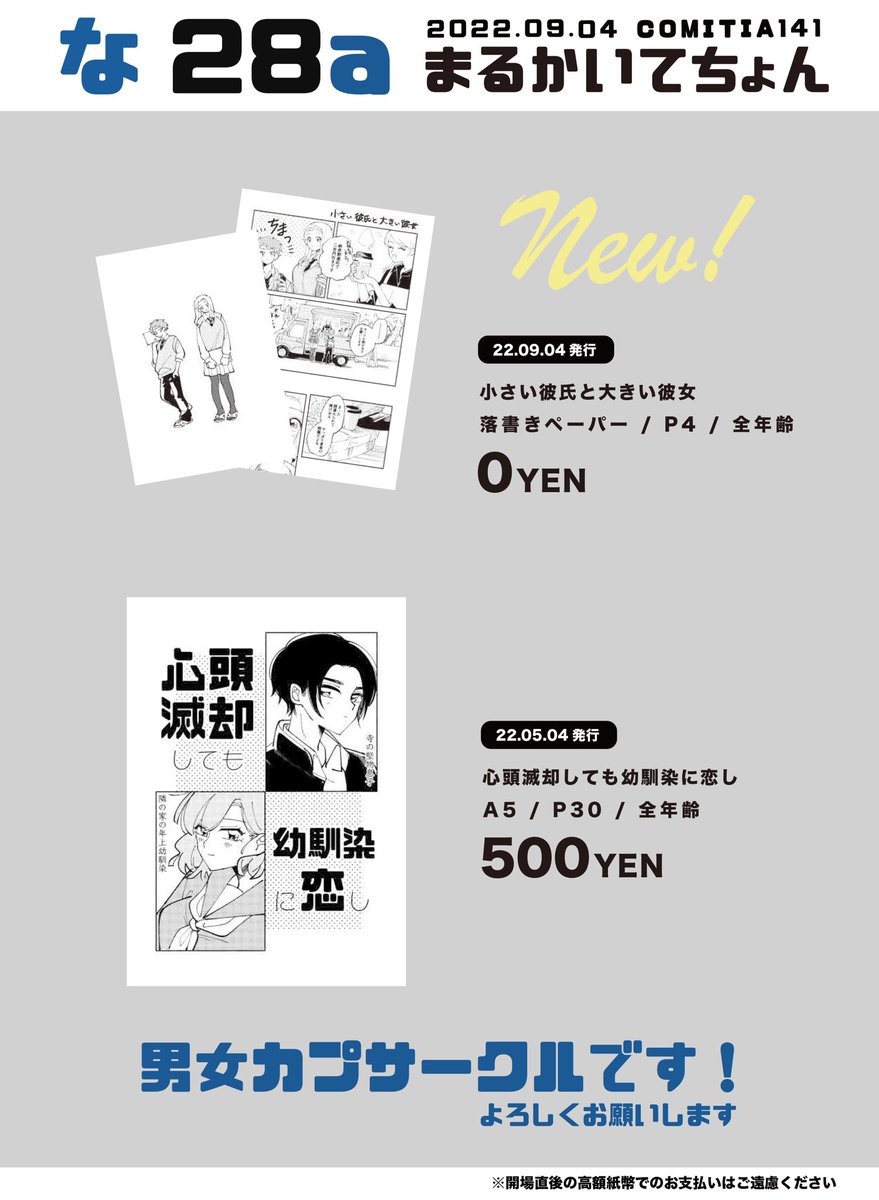 9/4 COMITIA141のおしながきです🌾 スペース:な28b サークル名:まるかいてちょん」 ▼5月発行既刊 「心頭滅却しても幼馴染に恋し」 ▼無配ペーパー🆕 「小さい彼氏と大きい彼女」 ご縁ございましたらよろしくお願いします…! #COMITIA141 #コミティア141 #コミティアお品書き