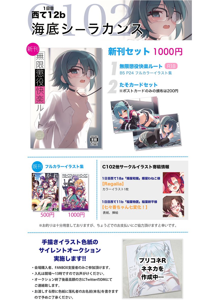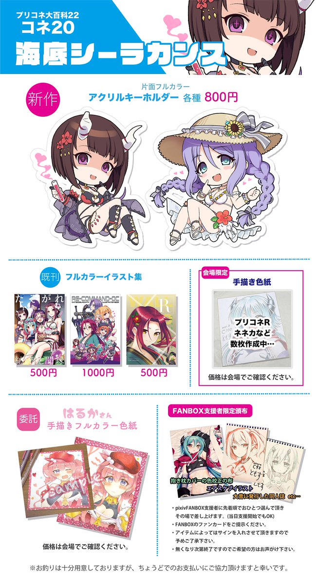 プリコネ大百科22のお品書きです 新作のアクキーとpixivFANBOX支援者に掘り出し物頒布をやります。 今回は委託でツムギちゃん絵師のはるかさん(@harukachanday)のアナログイラスト色紙の頒布もあります。 当日はコネ20「海底シーラカンス」でお待ちしております。 #プリコネ大百科22