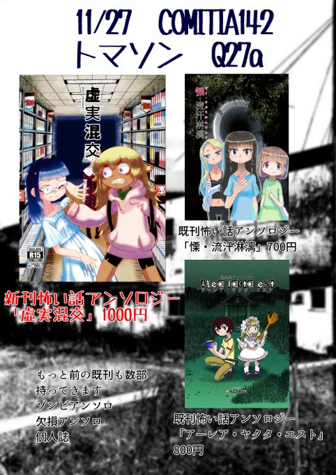 11月27日開催のコミティア142新刊出ます 怖い話アンソロジーです タイトル「虚実混交」 表紙込96p1000円 短編3作描きました ゲスト様は────── #コミティア142 #COMITIA142