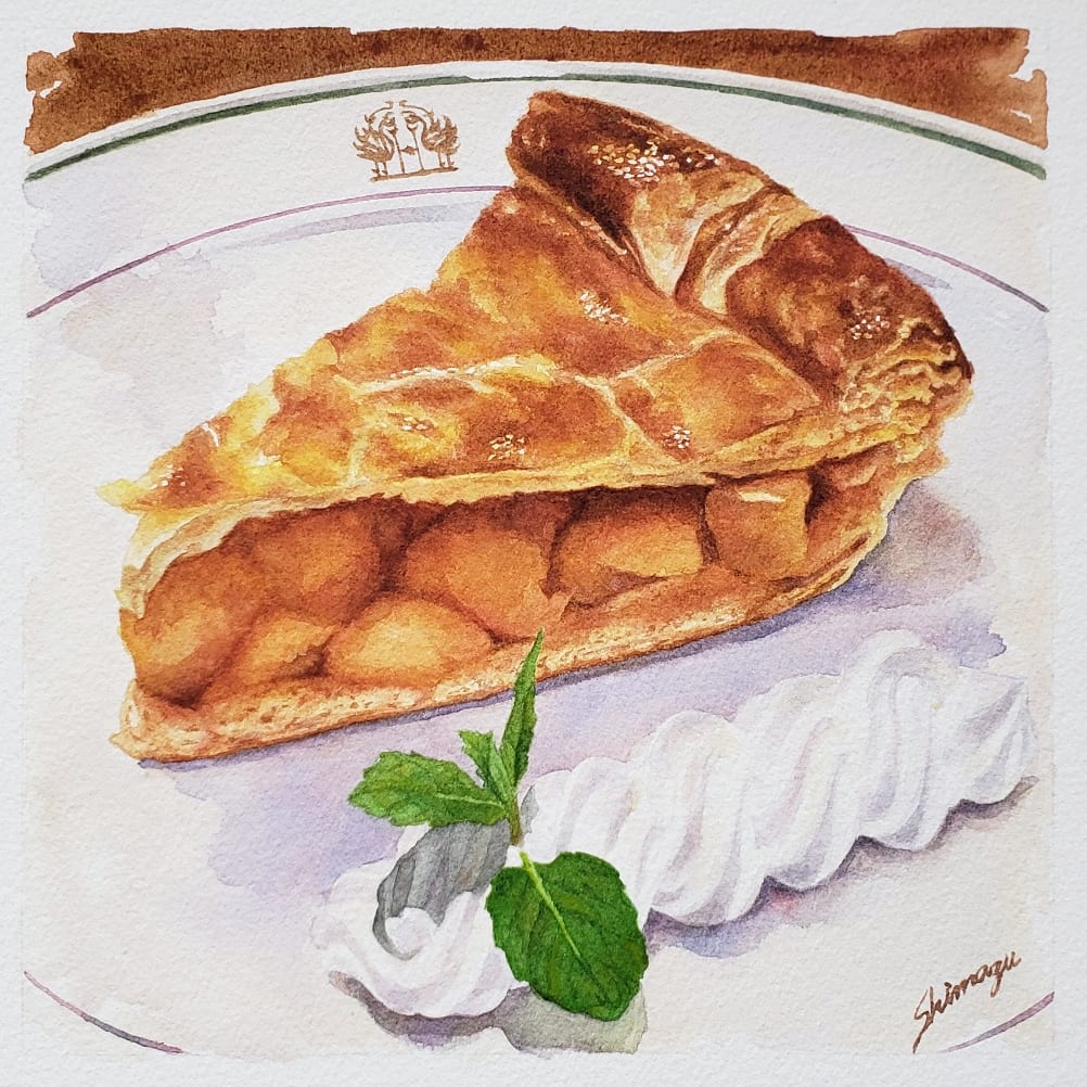 3 41 横浜にあるホテルニューグランド内のザ・カフェで食べたアップルパイです。生クリームたっぷりが特徴。 山下公園の向かいにある昭和2年開業の由緒あるホテルです。 #ホテルニューグランド #水彩画 #水彩イラスト #ファイヤーキング #fireking 21/05/23 09:31