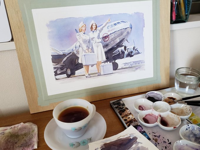 4 54 出来たてのホヤホヤの絵です。 TWAは古く(1925年設立)からあるアメリカの航空会社でしたが、2000年になってからアメリカン航空に吸収合併され今はもうありません。 #水彩画 #水彩イラスト #ファイヤーキング #fireking 21/03/14 14:14
