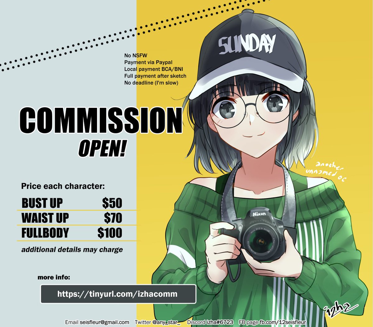 Hello! I'm opening art commission! RTs appreciated! Feel free to contact/DM me if you are interested Full body limited to 2 slots, and others are 3 slots (will open non-full body slots more if I managed to finish early)! For more info you can visit: tinyurl.com/izhacomm
