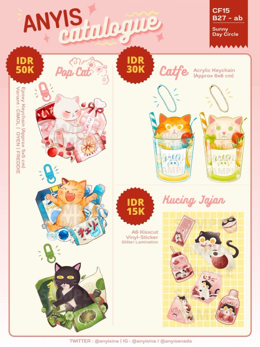(Shares appreciated!) Dropping anyis's #Comifuro15 catalog! Pre Order is Open till 1 Sept for Catfe and Kucing Jajan PO form: docs.google.com/forms/d/1hoiwH… Booking List is open till 15 Sept for Pop Cat epoxy Booking form: docs.google.com/forms/d/14bkQx…