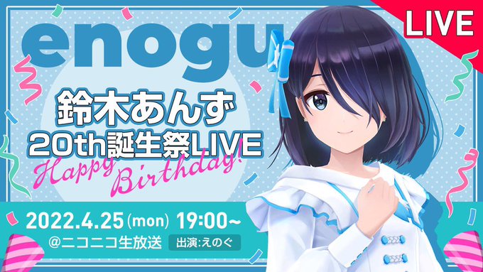 鈴木あんず20歳の誕生日を記念して… 初の『誕生祭ライブ』開催が決定! 『#鈴木あんず20th誕生祭ライブ』 開催:4月25日(月)19:00 会場:渋谷GRIT(無観客配信) 配信:ニコニコ生放送 live.nicovideo.jp/watch/lv336516… ※4/18(月)19:00チケット販売 出演:えのぐ ぜひ遊びに来てください(⸝⸝˃ ᵕ ˂⸝⸝)