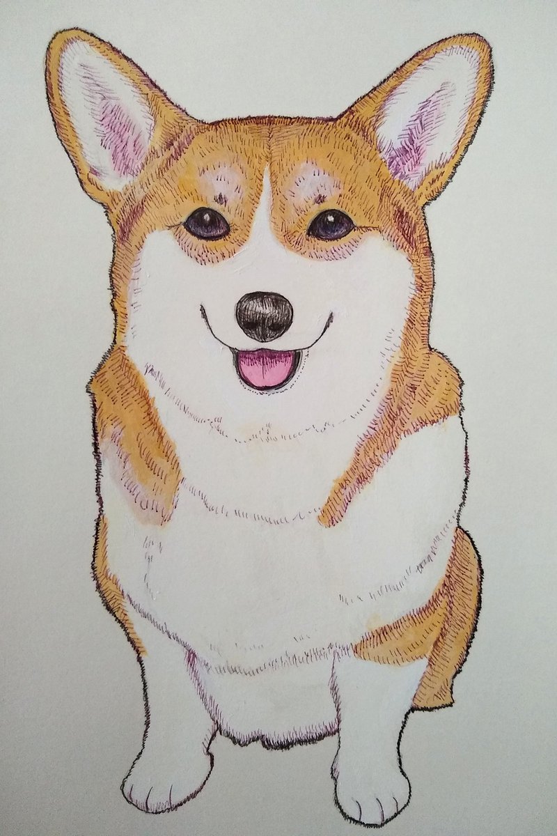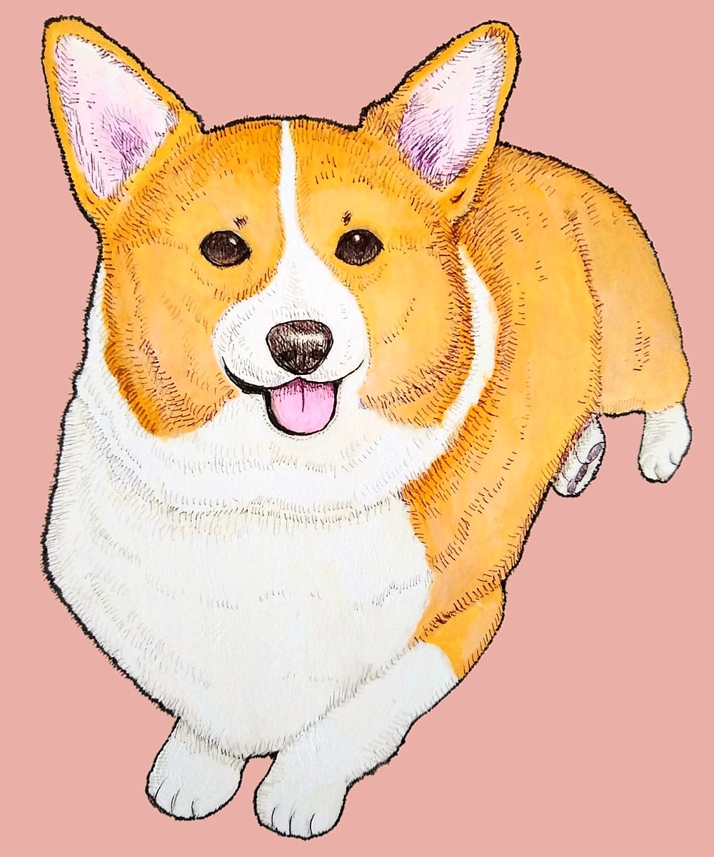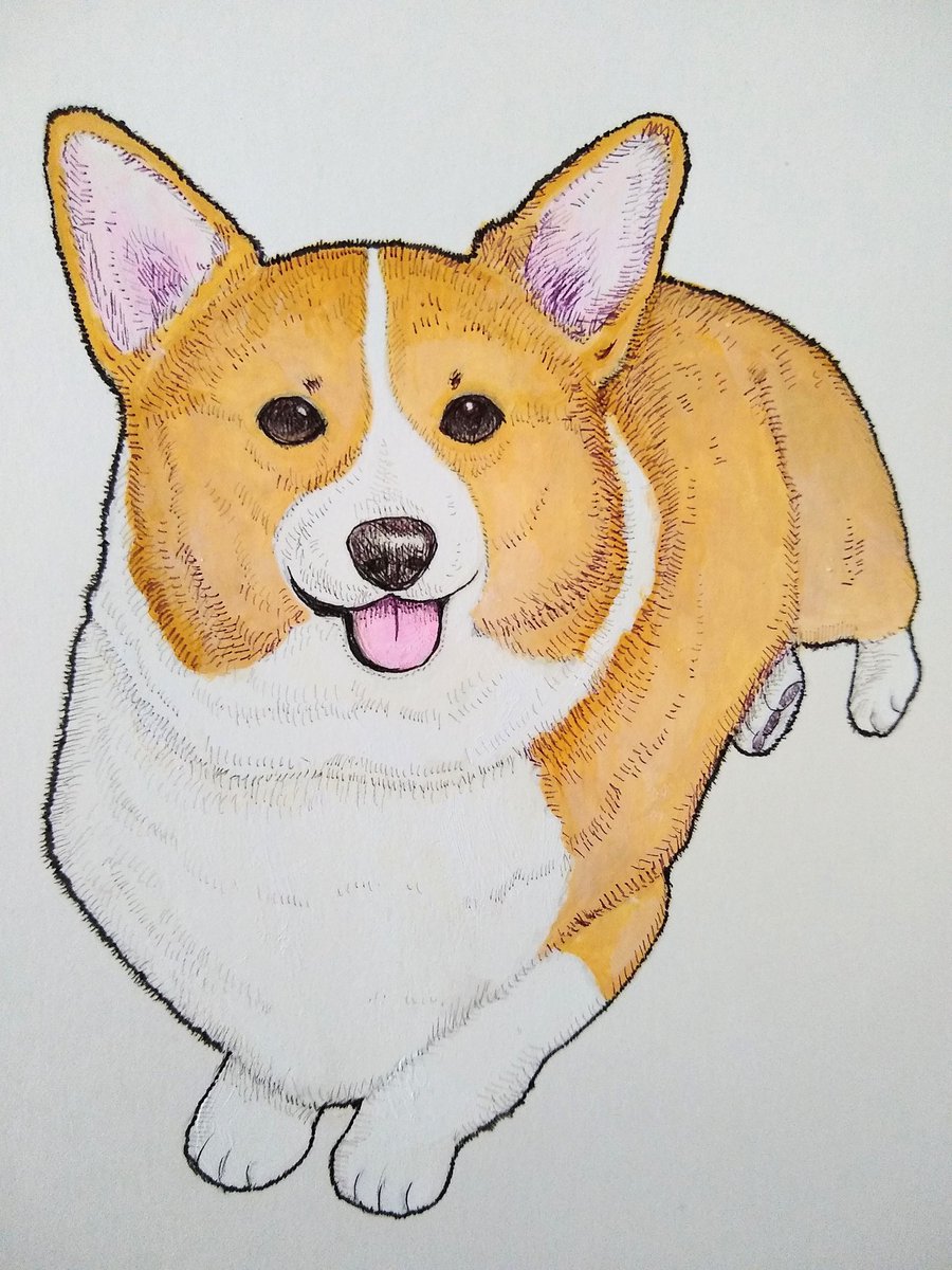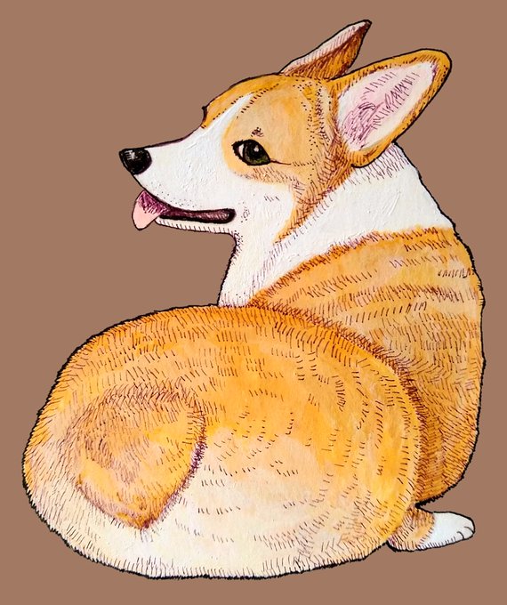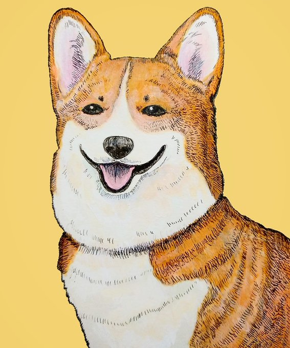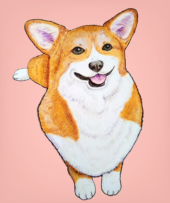 イラストメイキング完成 ペンで輪郭や毛皮、顔を描きました。コーギーを描いていると「ぼく可愛いコーギーちゃんだよ!」と言うコーギーの声が聴こえてきます(笑)私の描くコーギー達は、自己肯定感がとてつもなく高いです。 #メイキング #イラストメイキング #ペン画