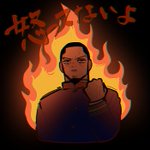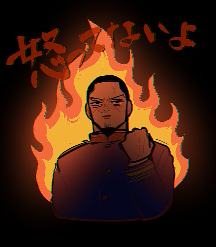 不機嫌なツキシマの顔を描くのが好きなんだけど、顔だけじゃ寂しいので何も考えず拳握らせて後ろ燃やしたらこういう絵が出来上がった。私は、怒ってないよ❤️🔥🥰