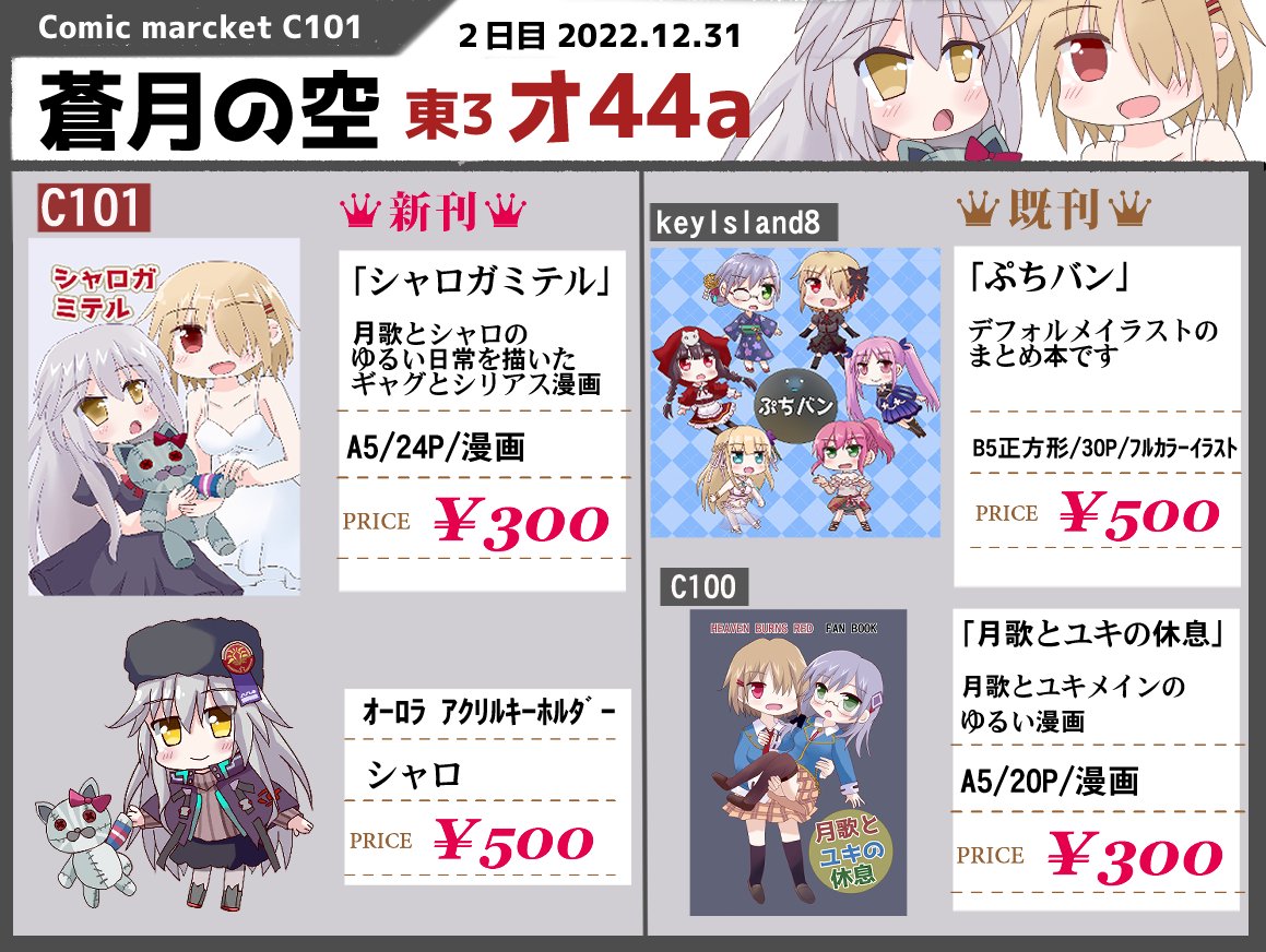 C101のお品書きになります。 12月31日 東3 オ-44a「蒼月の空」で参加します! ヘブバン本とシャロのアクキー出しますー。 当日はよろしくお願いします! 新刊サンプルはこのツリーにつけますー ■会場MAP webcatalog-free.circle.ms/Map#16808171/d…