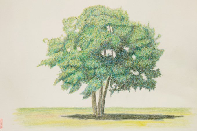 #イロドリアル上達ドリル を見ながら描いた木。相変わらずの、下塗りの薄さが最後まで尾を引いてしまう。描き始めて、改めてモノをよく観ていないことに気づく😓 #イロドリアル #色鉛筆画 #絵描きさんとつながりたい