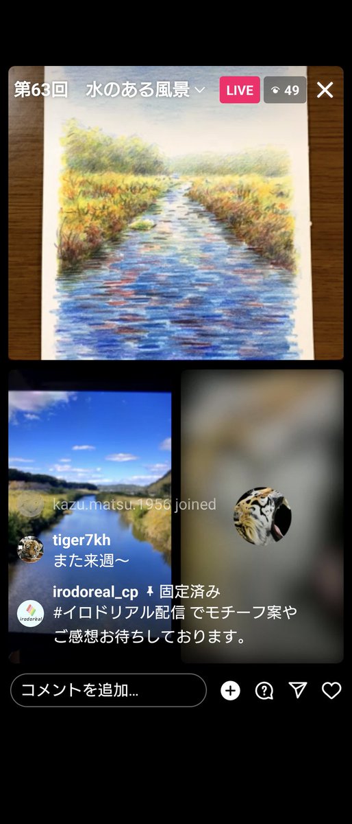 今日の #イロドリアル配信 は三賀さんによる、水面。 トークはボンボン先生のツッコミと石川さんのボケ(笑) 青で下描きをして、黄色と赤で色付けです。 絵は強調することも重要だということを、学べました。 #色鉛筆画 #絵描きさんとつながりたい