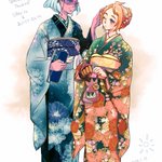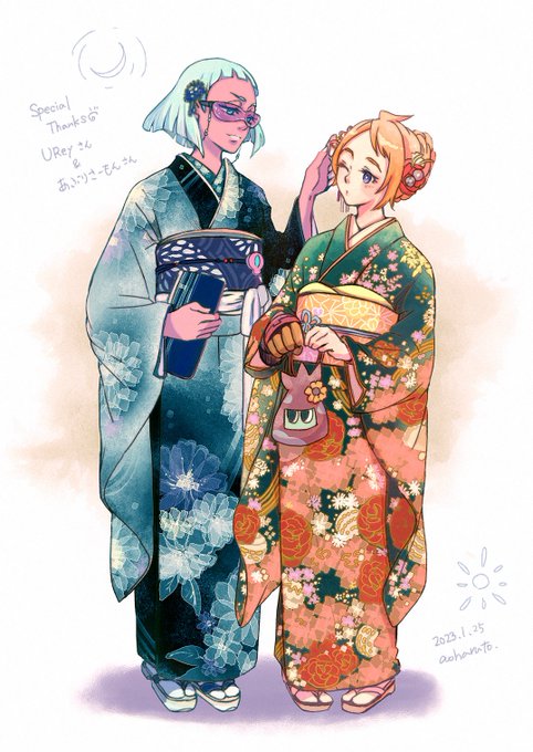 @ureyite403 @salmon_aburi1 あぶりさーもんさんから、UReyさんの小説のジルさんに似合いそうな振袖資料をご提供いただきまして…さーもんさんデザイン振袖のナッちゃんと一緒の二人を描かせていただきました…!🙇♀️ いつも素敵な小説&イラストをありがとうございます~っ😭🙏 twitter.com/ureyite403/sta…
