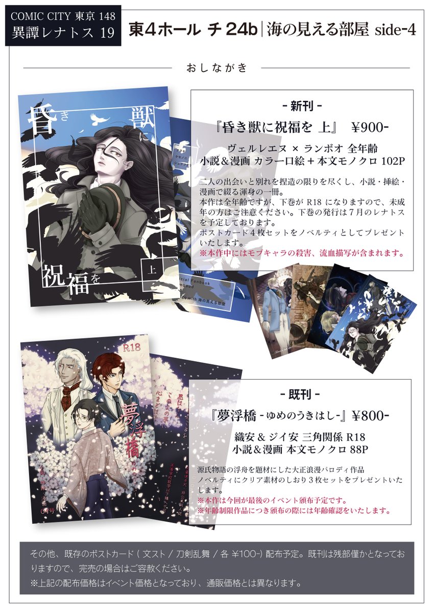1/29 異譚レナトス 19 お品書き&サンプル pixiv.net/artworks/10443… 新刊のサンプルを公開しました。 【昏き獣に祝福を 上】 イベント頒布価格 ¥900- ヴェル蘭 全年齢 小説&漫画 カラー口絵4P+本文モノクロ102P 下巻は7月の頒布を予定しております。 通販はイベント終了後ご案内いたします。