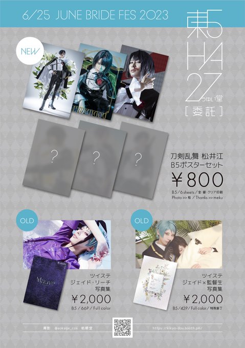 【お品書き】*RT嬉しいです* 東5は27ab ✨新:松井江B5ポスターセット 🐬既刊:ジェイド写真集、ジェイ監写真集、🐦⬛創作写真集(残3) 顔ちんさん(@t0r0v00)のサークルにて委託頒布となります 当日は売り子でおります🙋🏻♀️ イベント後発送で通販予約受付中です☺ kikyo-dou.booth.pm #ぅゅぃ堂
