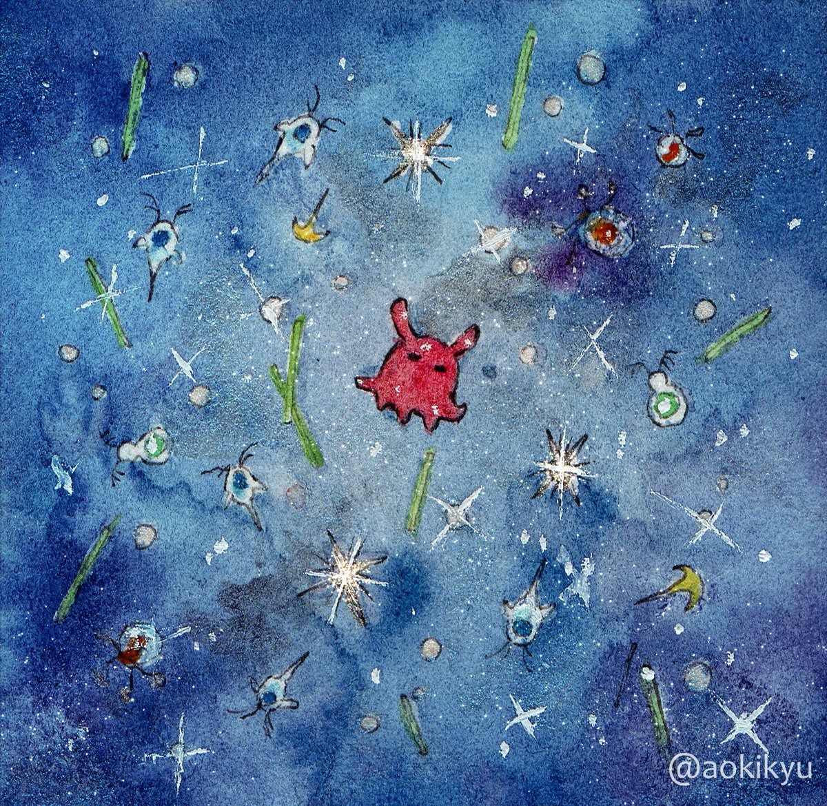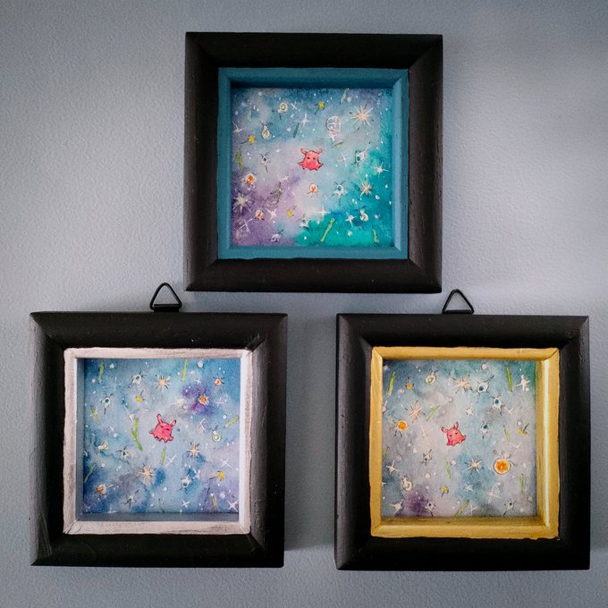 1 5 メンダコの赤ちゃんと微生物が漂う、おおきな海のちいさな世界を描きました。いきものや海がキラキラ光ります🐙✨ 『Drifting friends-まったり-』 『Drifting friends-ゆらり-』 『Drifting friends-ふわり-』 #ミニ原画 #水彩画 #透明水彩 #水彩イラスト 22/06/24 12:43