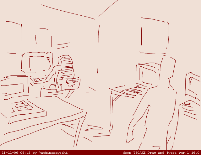 今朝見た夢、あるビルの屋上、小さな小屋の様なゲームセンター、マイコンが並ぶ。ボロボロの部屋80年代の部屋。ただ一人ゲームをプレイする男性。彼は死亡済み、彼のプログラムが彼の後悔を背負い存在しつづけるそんな妄想 #tegaki_dt