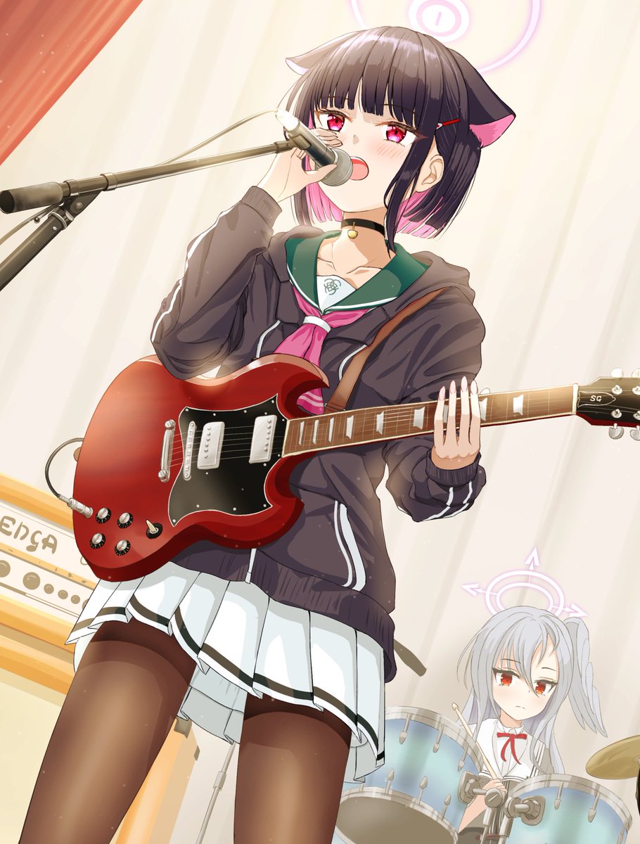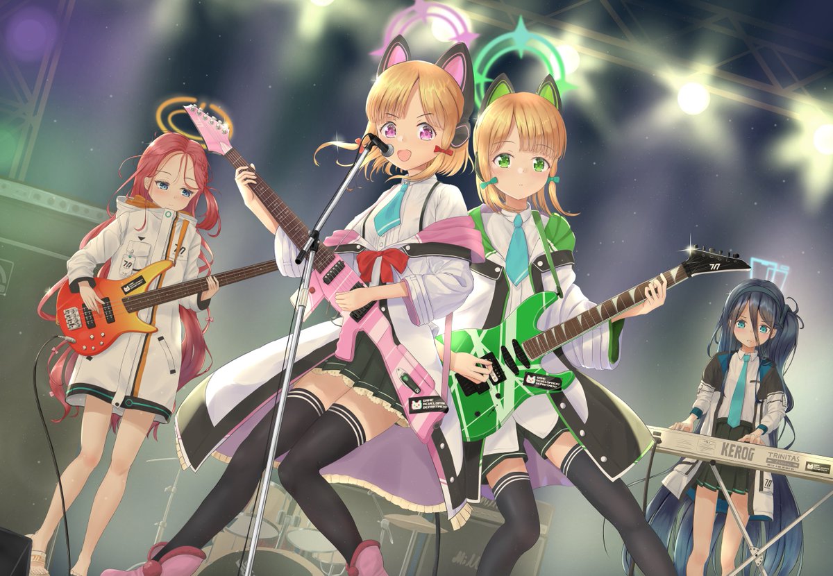 学園横断の文化祭があったらエモい曲やっててほしいメンツ たぶんカズサは歌うまい カヨコのギターはテクニカル スズミのドラムは激しいそう ベースいないけど多分見切れてるだけってことで #ブルアカ #BlueArchive